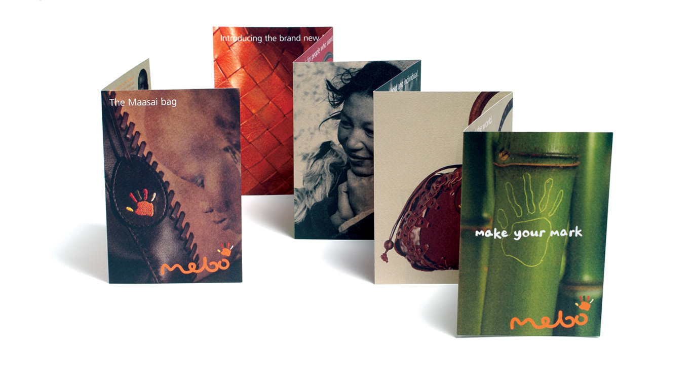 I designed the mebo brand, including name generation, for a new range of ethically-produced handbags. The accompanying mailer also raised awareness of Survival – a charity aimed at helping indigenous peoples who face eviction from their own land.